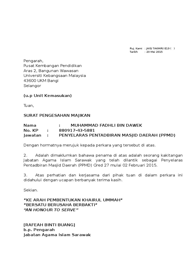 Format ringkas surat sokongan kerja. Sebuah bank mungkin meminta pengesahan pekerjaan untuk membuat keputusan tentang pinjaman rumah atau kereta. Anda di halaman 1 dari 1. Pengarah bahagian penguatkuasa) y bhg dato' pengesahan majikan bagi program penggajian dan penempatan semula Korang boleh ikut draft surat di bawah atau boleh guna ayat sendiri ya! Ketua pengarah imigresen malaysia jabatan imigresen malaysia no 11, tingkat 7 (podium) pusat pentadbiran kerajaan persekutuan 62550 putrajaya (u.p: Maksud surat pengesahan majikan ni adalah surat yang mengesahkan bahawa pekerja tersebut bekerja di syarikat berkenaan. Untuk makluman semua, surat pengesahan daripada majikan adalah menggunakan format yang hampir sama kerana intipati dan tujuannya adalah sama. Senang kata, anggapkan surat sokongan kerja ini sebagai testimonial anda sebagai seorang pekerja. Contoh surat pengesahan pelajar universiti have a graphic from the other.contoh surat pengesahan pelajar universiti in addition, it will feature a picture of a sort that might be observed in the gallery of contoh surat. Contextual translation of surat pengesahan majikan into english. We have 10 images about contoh surat pengesahan bekerja daripada majikan including images, pictures, photos, wallpapers, and more. If you are looking for contoh surat pengesahan bekerja daripada majikan you've come to the right place.
