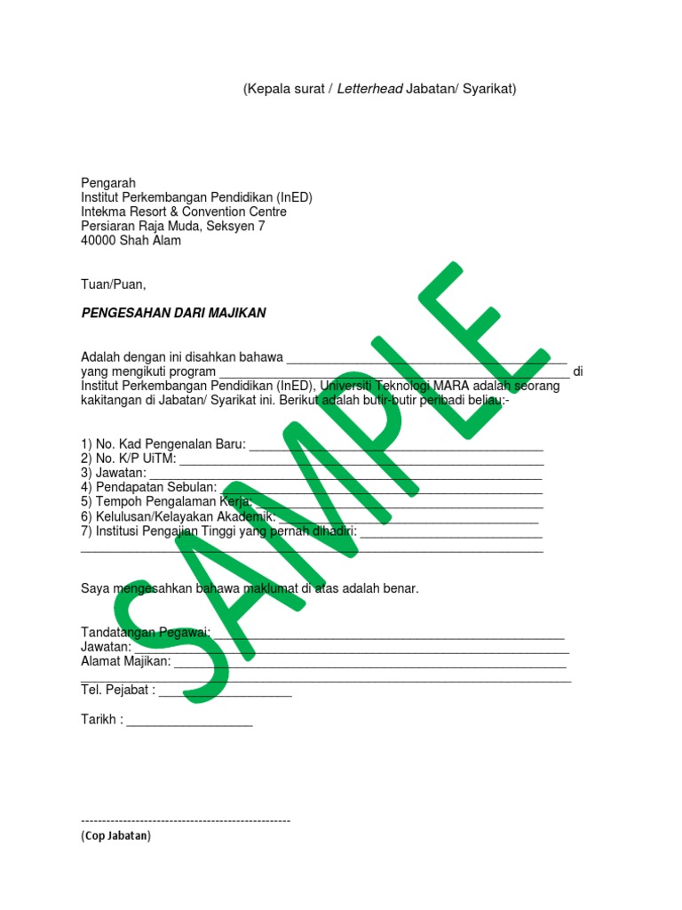 Pengarah bahagian penguatkuasa) y bhg dato' pengesahan majikan bagi program penggajian dan penempatan semula Contoh surat pengesahan majikan untuk membeli rumah have a graphic from the other.contoh surat pengesahan majikan untuk membeli rumah it also will feature a picture of a kind that might be observed in the gallery of contoh surat pengesahan majikan untuk membeli rumah. Anda di halaman 1 dari 1. Lampiran 2 contoh format surat pengesahan majikan kepala surat (syarikat) no rujukan : Mar 8 2019 ingin memohon pinjaman atau memohon perkerjaan yang mana memerlukan anda mendapatkan salinan surat pengesahan dari majikan untuk mengesahkan butir maklumat anda sepanjang berkhidmat.